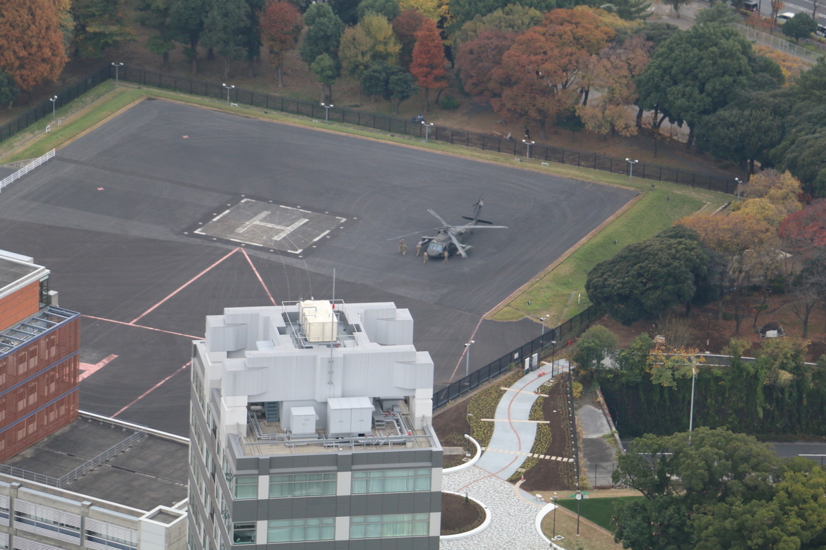 直下には赤坂プレスセンターがあり最近トランプ前米国大統領も利用したヘリポートが見えます。
