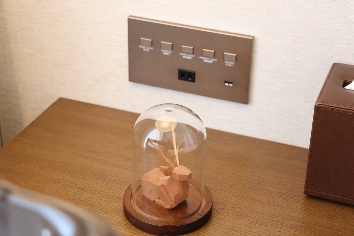 ベッドサイドの鹿さんにピントがあってしまいましたが、ホントは後ろのスイッチを撮りたかったんです。(笑)