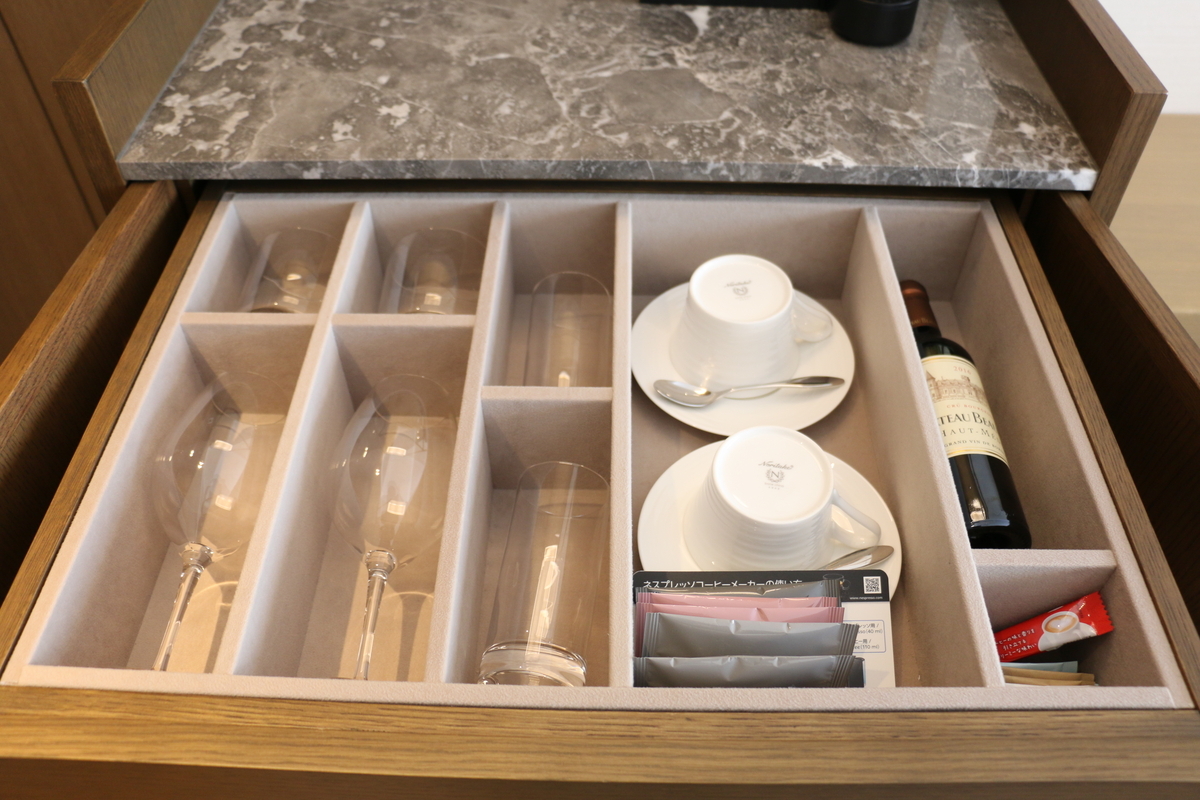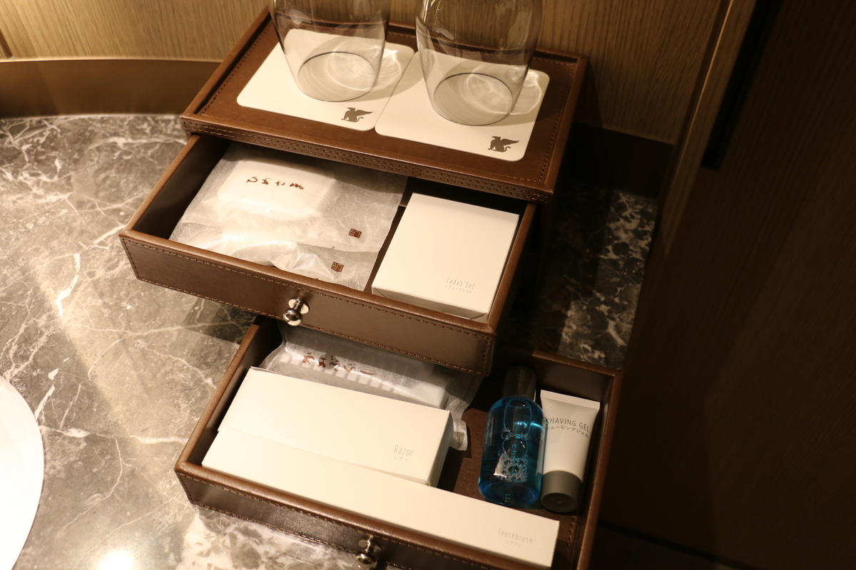引き出しの中はマイナーチェンジされており、化粧水などのレディースセット、和風のコットンなど以前は頼まないといけなかったものがセットされていました。
