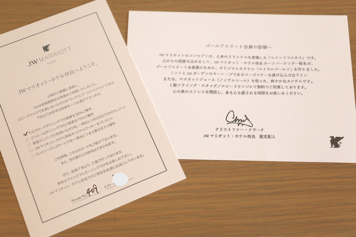 チェックイン時にエリート特典の説明がありました。