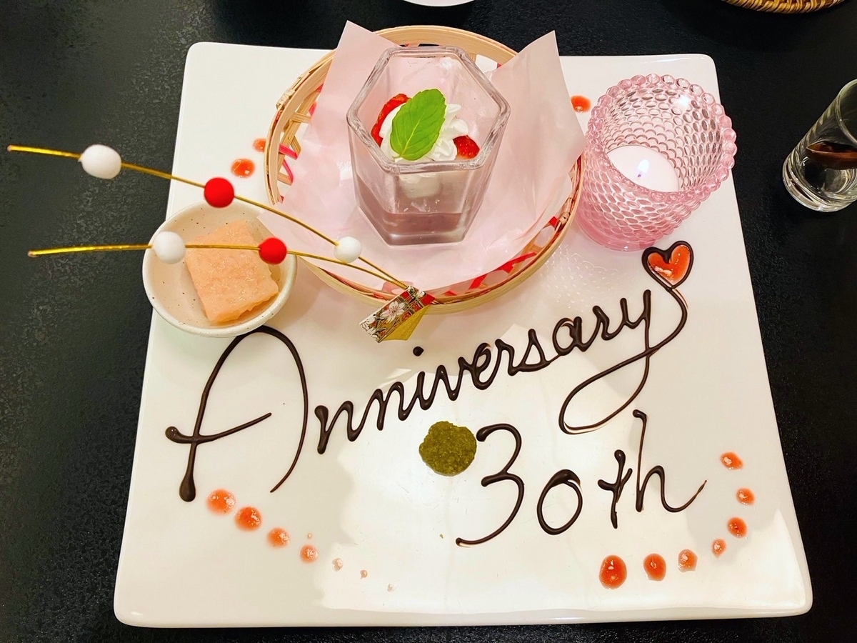 花火点いた状態で運ばれてきたので、「あれ?なんかの記念日だったかな(ヒヤヒヤ)」と思ってたんですが、スペイン村30周年の「記念日プレート」でした笑